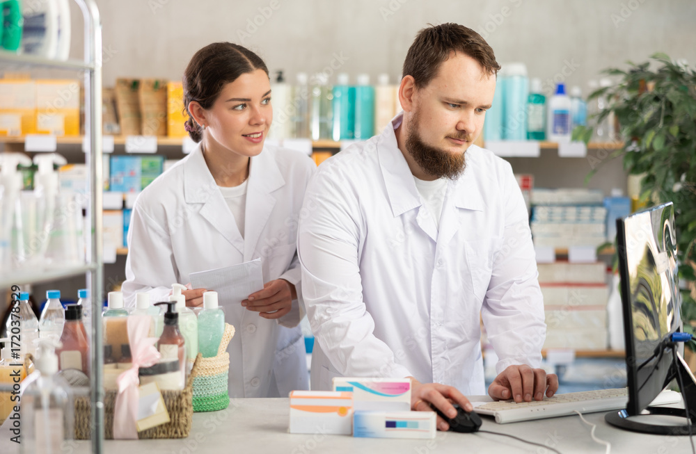 Man pharmacist at computer communicate with girl colleague. Employee discuss about treatment protocol, selects available drugs for treatment regimen