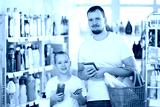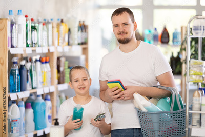 Dad and son visitors purchased necessary goods in store, with full basket of household chemicals, they look at shelves, looking for missing detergents for cleaning kitchen.