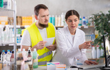 Qualified female pharmacist gives advice on medicines and tablets for a builder. Male construction worker with medical prescription in European pharmacy