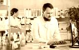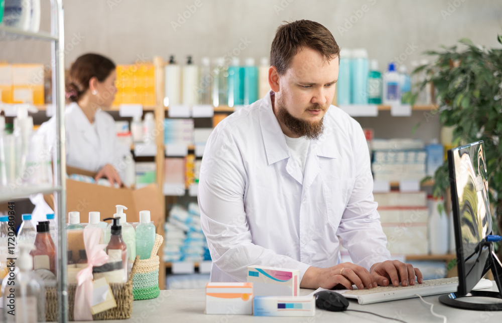 Man pharmacist uses computer at workplace. Employee reads regulations and laws, makes report, reads information about drugs. Girl assistant lays out pills merchandise in background