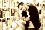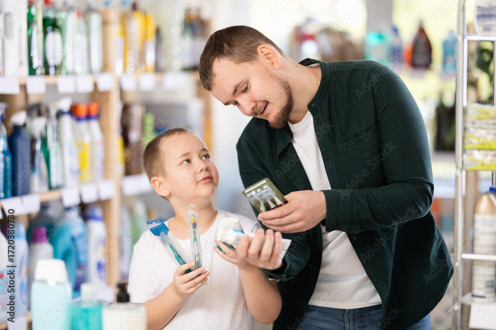Young man with his son buyers choosing toothbrush in household chemicals store
