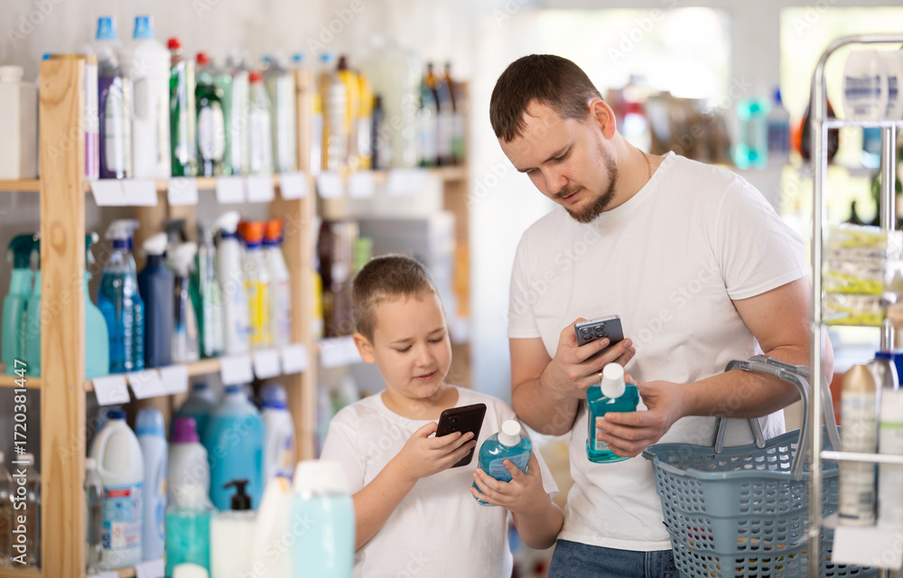 Dad and son scan barcode on packaging of mouthwash, looking for information about product on website. Boy watches actions of dad, learns to scan QR code using phone camera