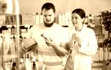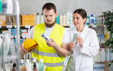 Male construction worker holding a package of cooling ointment for muscles and joints, he consults with a female pharmacist about choosing an ointment