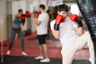 Classes for professionals and boxing enthusiasts. Guy kicks and punches hanging punching bag, trains speed and strength of striking blow, strikes an imaginary opponent