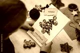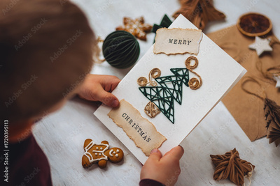 Concept of Christmas craft, handmade presents, family leisure time, hobby, recreation. Little kid with paper postcard with new year fir tree embroidering. Gingerbread cookies, lights, cozy atmosphere
