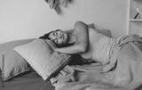 Brunette woman enjoying restful sleep at home, arms folded under pillow, gentle smile on face, representing emotional security, slow living and balance in everyday routine.