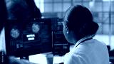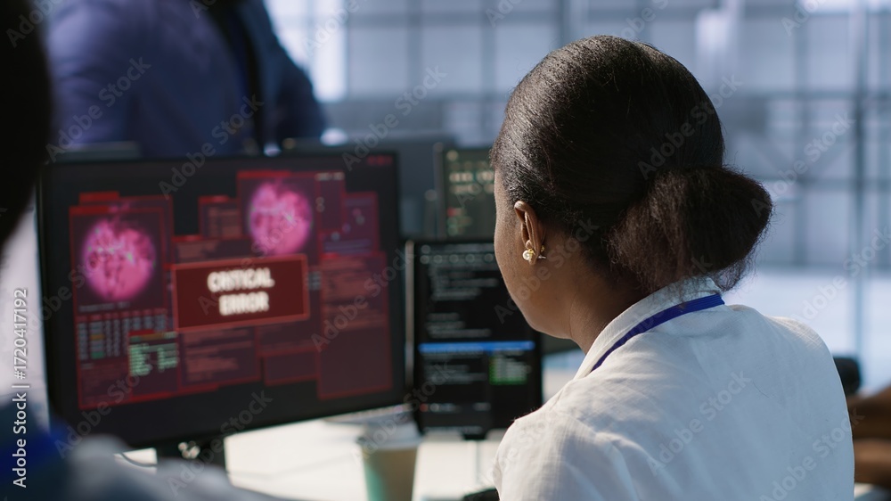 Cybersecurity experts in server farm trying to protect equipment from hacker stealing data. Close up of data center IT professionals struggling to delete virus attacking company servers, camera A