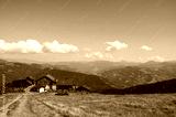 Scenic landscape with wooden house on grassy hillside. The buildings overlook multiple layers of forested mountains that recede into the blue haze of the distance under clear sky with scattered clouds