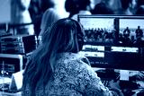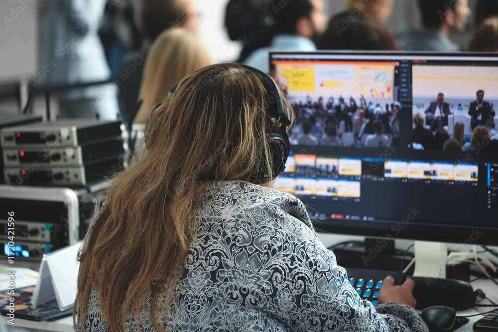 Woman wearing headphones sits in front of computer monitor. She's working on project or controlling audio and video during presentation. Concept of concentration, learning, and productivity.