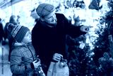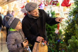 Father with son choose a Christmas tree and balls at the fair. Joyful father and son watch with interest and buy holiday decorations for the New Year