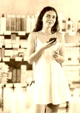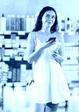 Young woman scans barcode of a package with a repellent in a pharmacy on her phone