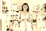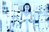 Girl buys antiallergic pills at pharmacy and compare with other medicine, carefully reads patient information, checks composition of drug. Checks for absence of harmful substances, view product in