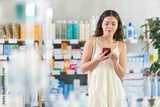 Beautiful woman in summer dress standing in pharmacy and choosing ointments and creams with phone. Woman scrolls through the shopping list on mobile and examines the shelves with medicines