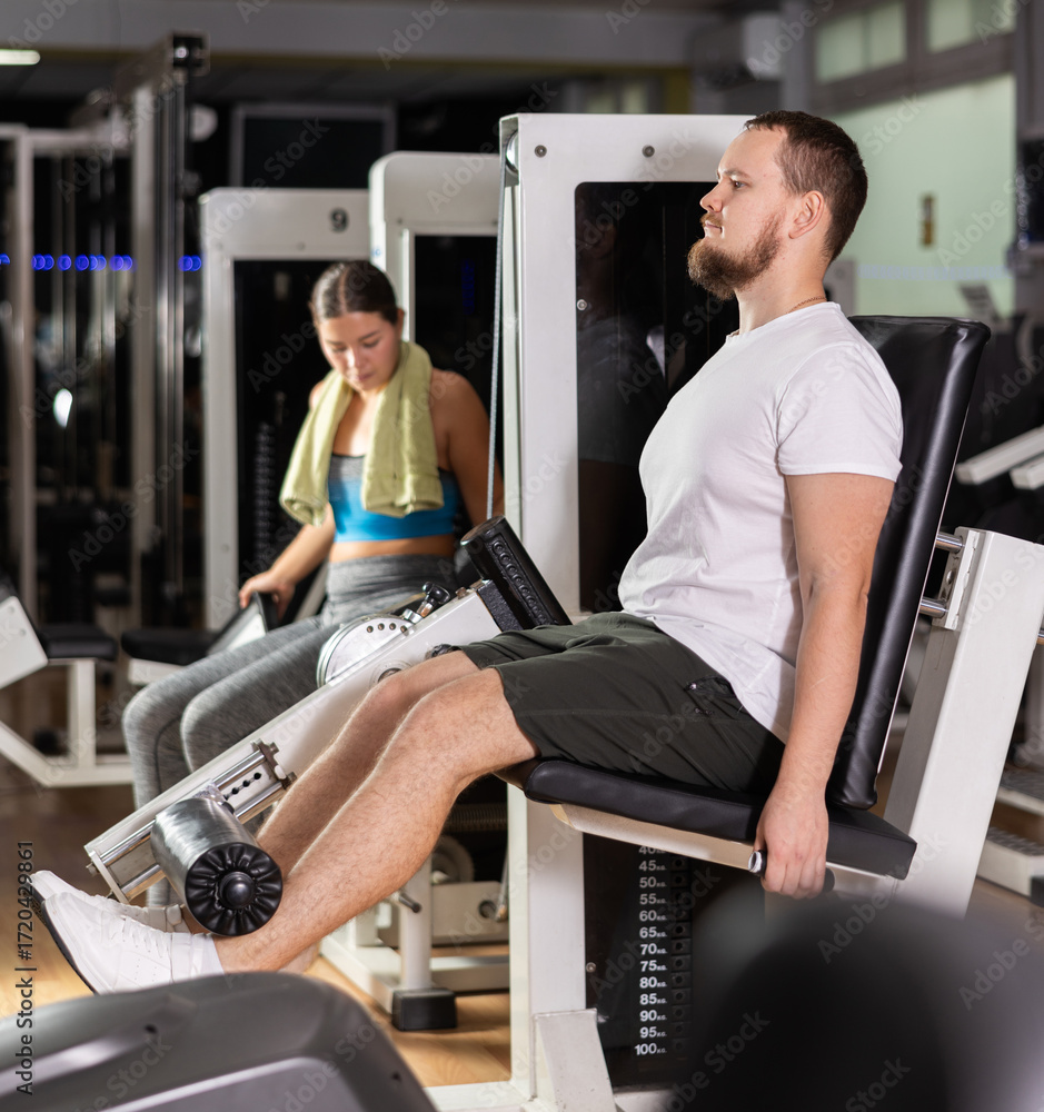Bearded man gym coach uses fitness equipment to strengthen muscles of leg, and does exercises in gym. Athlete creates strong and attractive body through physical activity