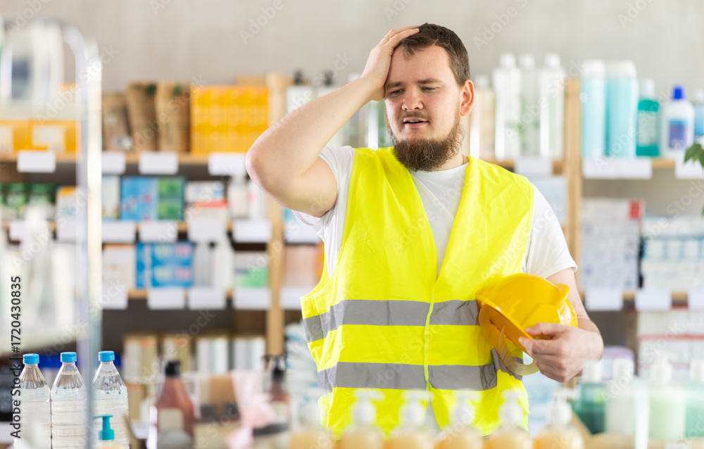 Male worker in a yellow vest looks for medicine for head pain in a pharmacy