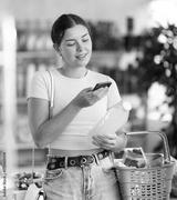 Young woman buyer scanning qr code for bottle of soda in grocery store