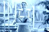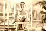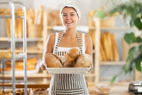 Happy young saleswoman displays bread in square wicker basket in bakery shop