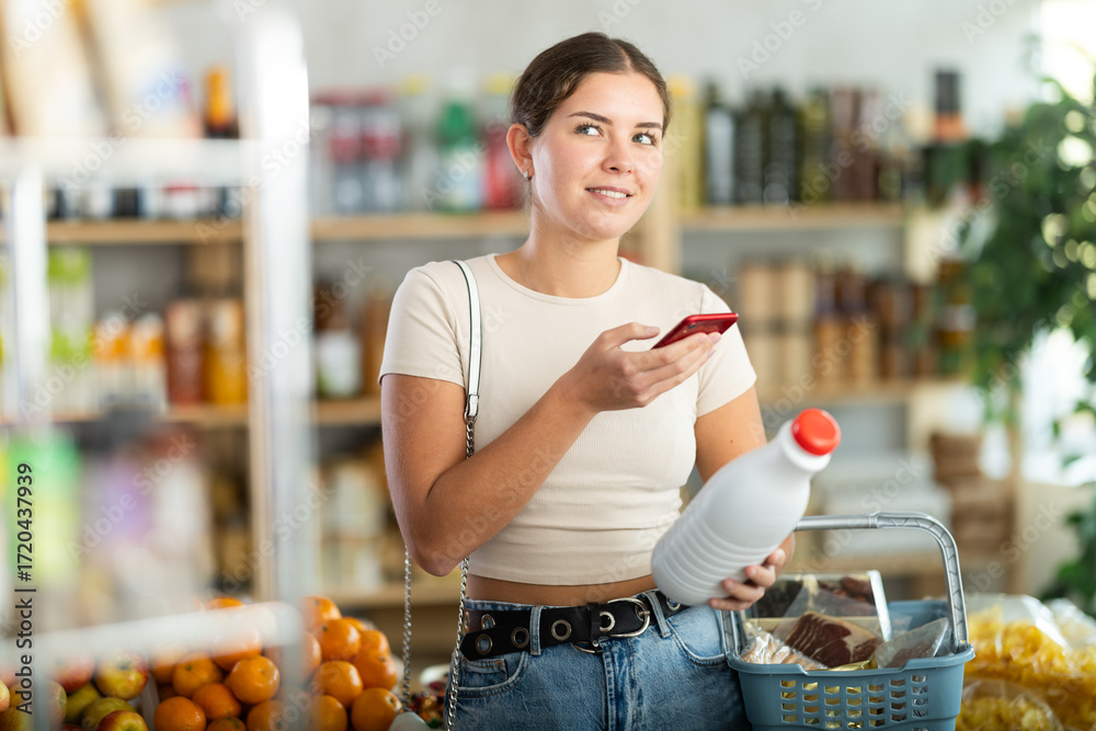 Woman in store scans QR code on milk bottle. With help of mobile app, buyer receives information about product. She checks manufacturers data in registry database of national agency