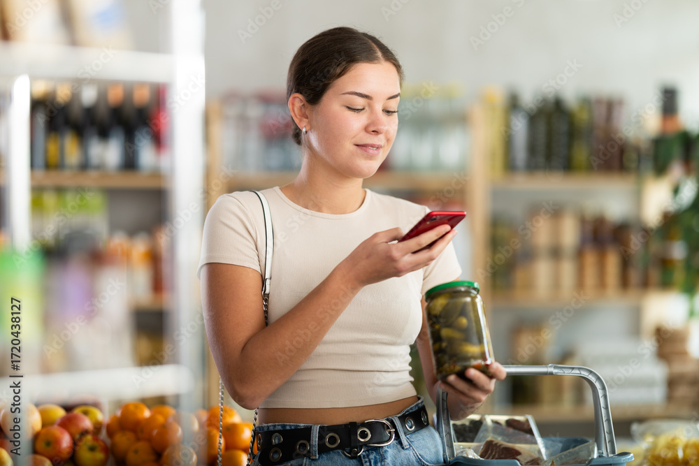 Woman customer at shop scan QR code on pickled cucumbers package using phone camera. Client study composition, manufacturer information of product using application.