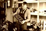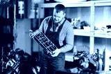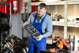 Qualified male mechanic in uniform holds a part from a car in his hands. Repair and replacement of parts in a car service