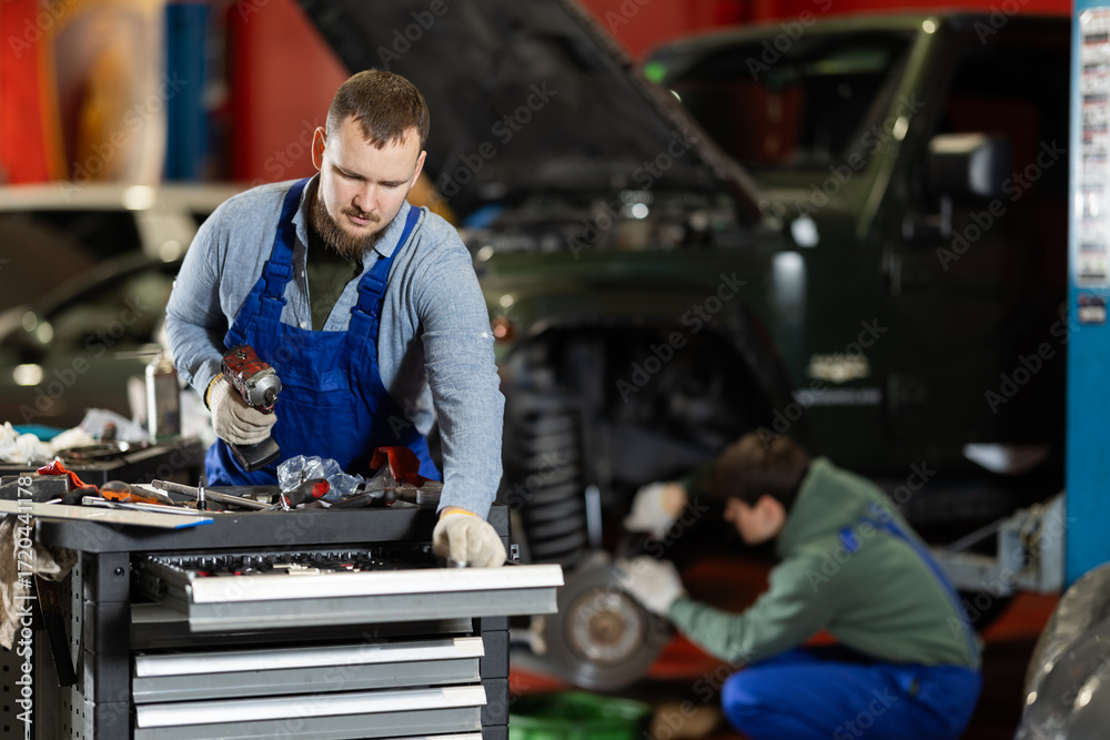 Man chooses tools to repair a car. Mechanics use tools to fix a broken car in a car service
