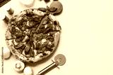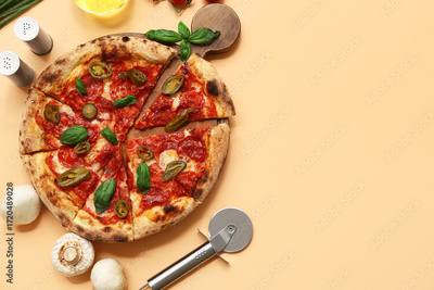 Composition with tasty pizza, ingredients and cutter on beige background