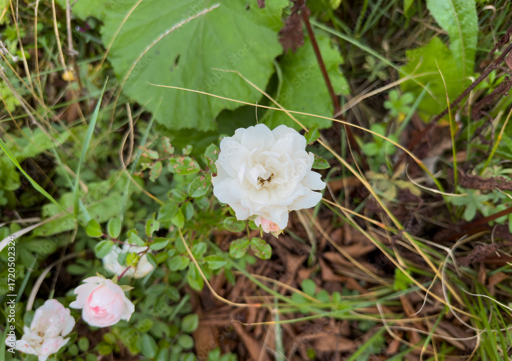 A delicate white rose, one of the last blooms of the season, blossoms in a wild and natural autumn garden