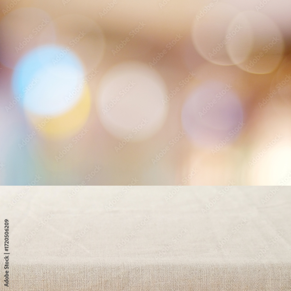 Empty table with linen tablecloth over blurred abstract with bokeh background banner, food and product display montage template, backdrop, wallpaper
