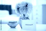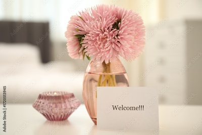 Card with word Welcome, vase with flowers and candle on white table indoors