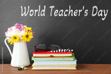 Happy Teacher's Day greeting card with flowers and text on blackboard