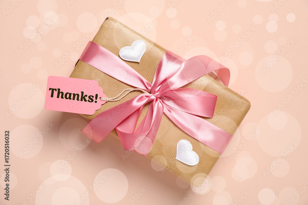 Thanks tag attached to gift box on dark beige background. Bokeh effect