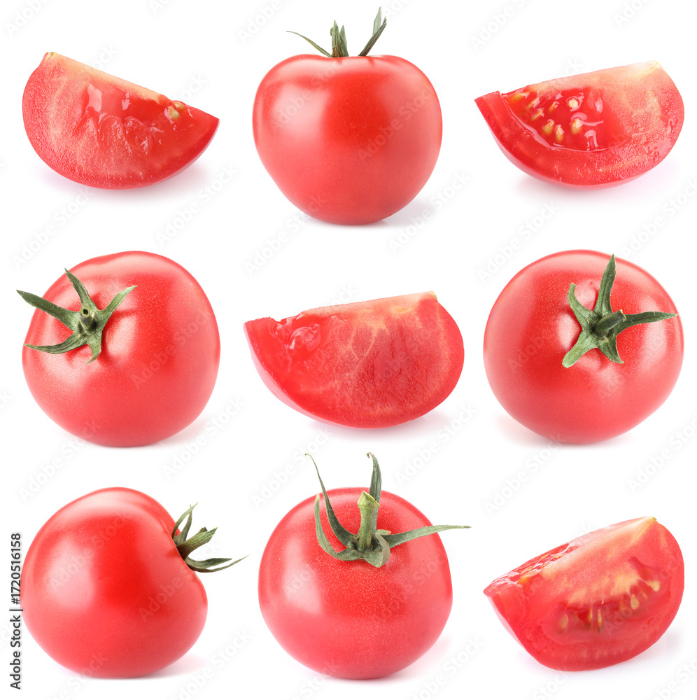 Fresh ripe tomatoes isolated on white, set. Whole and sliced