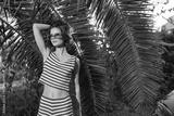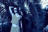 A fashionable young woman wearing a red striped crop top and matching shorts stands outdoors beneath a palm tree, posing confidently with sunglasses.