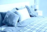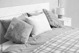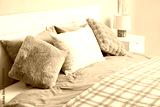 Comfortable bed with beige pillows and blanket near beige wall in bedroom, closeup