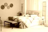 Big comfortable bed and bench near beige wall in interior of bedroom