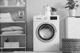 Interior of light laundry room with washing machine, shelf unit and bed sheets