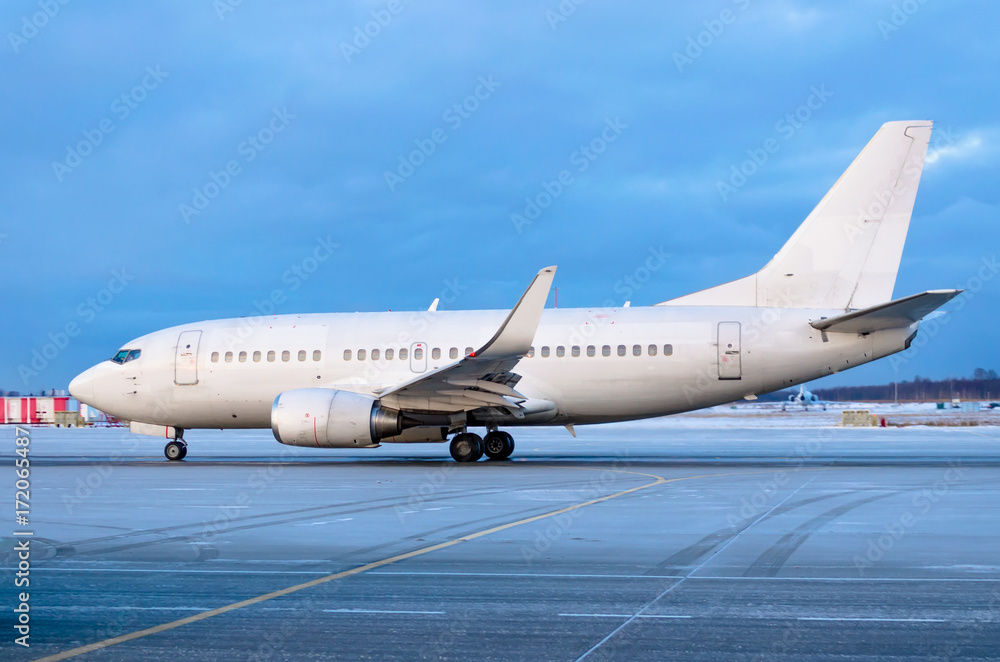 Passenger airplane on taxi in winter on slippery icy asphalt