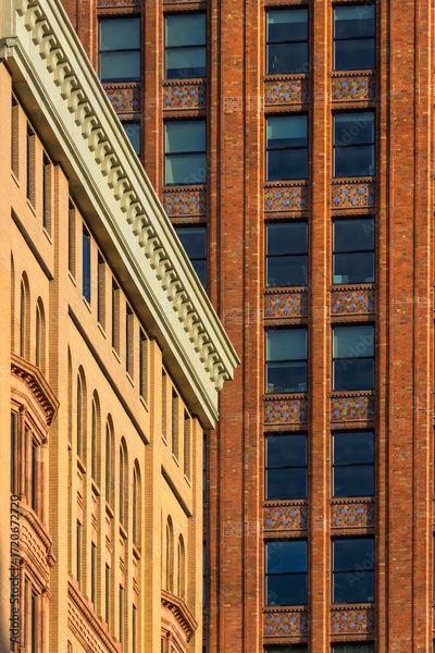 Tall historic brick buildings evening sunlit in Detroit downtown, Michigan