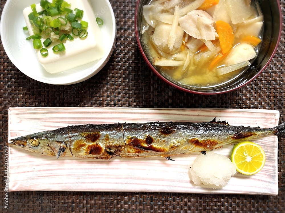 A Japanese autumn meal of grilled salted saury and pork miso soup