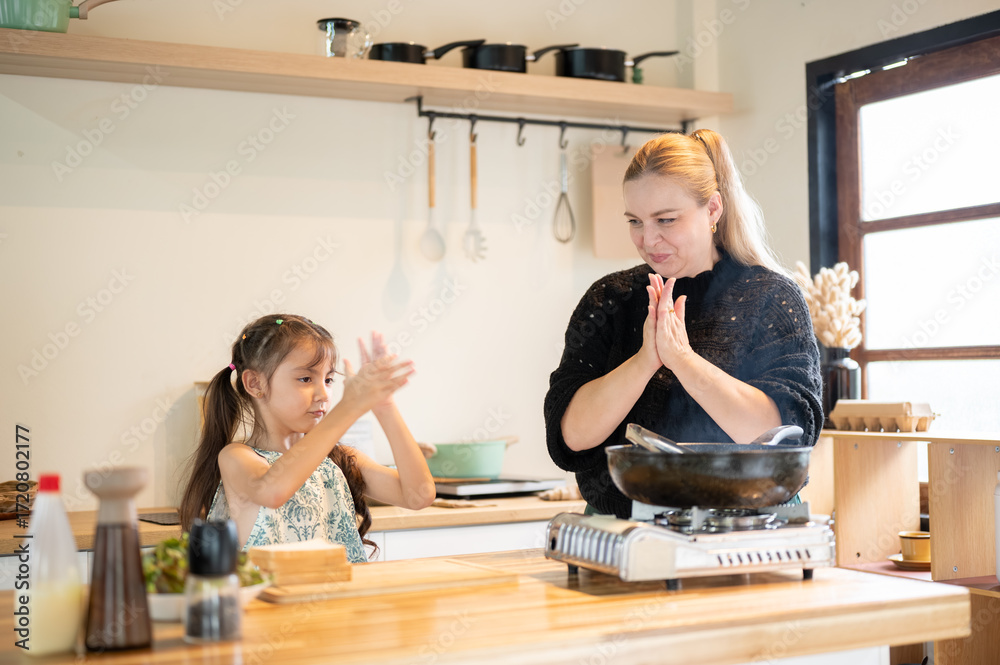 Asian daughter clapping with caucasian white mother learn to make sandwich at kitchen cooking counter.