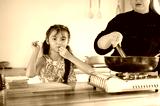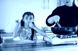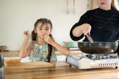 Kid daughter eating vegetable while white mother cooking in pan on stove standing at kitchen counter