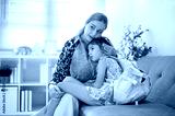 Caucasian whites mother hugging and patting kid girl daughter while sitting on sofa in a living room