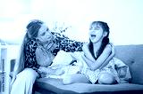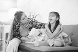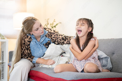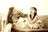 Caucasian whites mother looking at laughing asian kid daughter while sitting on sofa in living room.
