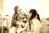 Caucasian mother organizing school bag for asian kid daughter while sitting on sofa in a living room