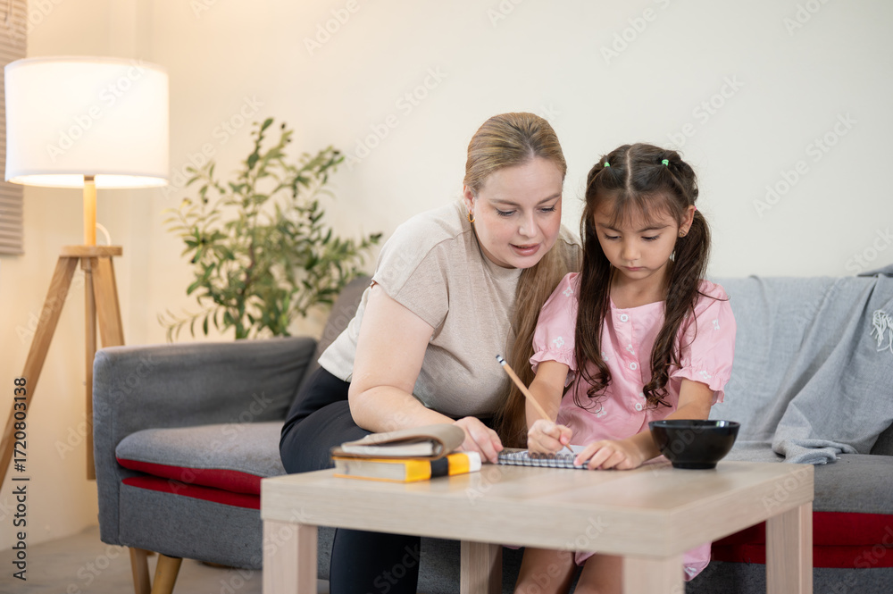 Caucasian mother teaching asian girl kid daughter to do homework at table aside sofa in living room.