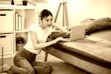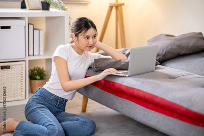 Asian woman holding head on hand looking at laptop while sitting leaning against sofa bed on floor.