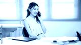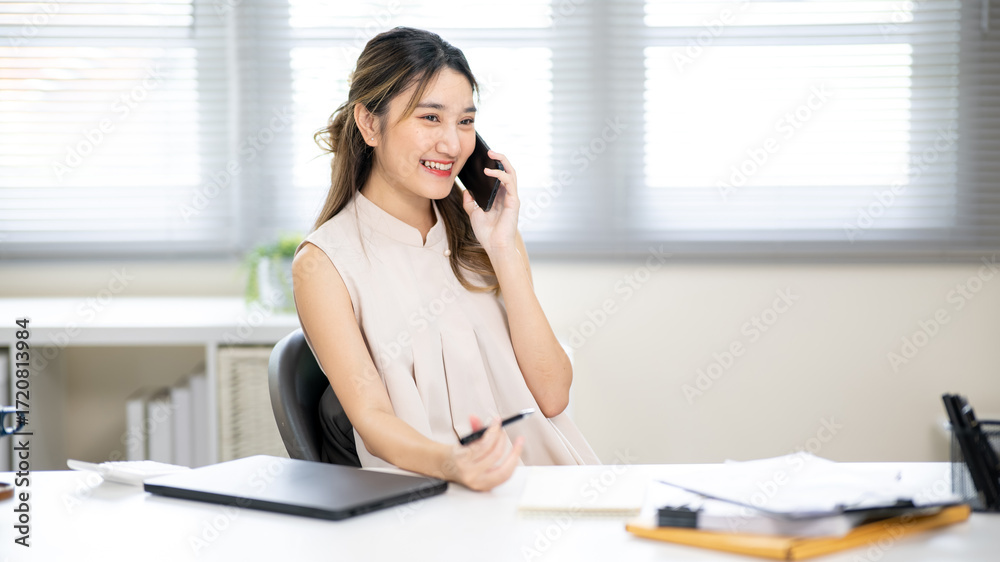 Pretty woman office worker holding pen talking to a friend or coworker on phone at table in office.