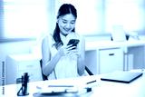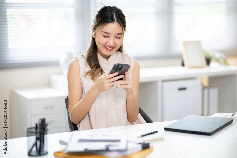 Smiling woman office worker holding smartphone in both hands typing or chatting at table in office.