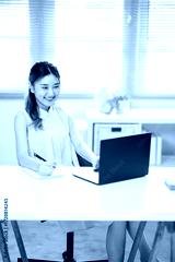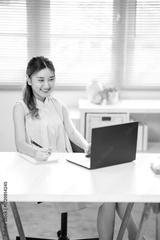 Happy woman office worker holding pen over notebook and looking at laptop on white table in office.