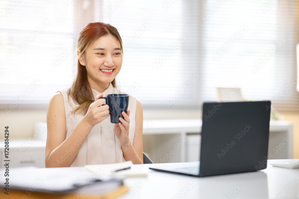 Smiling woman office worker holding coffee mug cup while looking at laptop on white table in office.